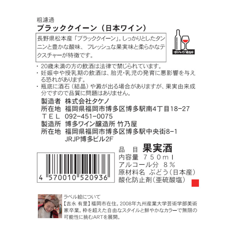 長野県産の「ブラッククイーン」を九州初の都市型ワイナリー「博多ワイン醸造所」にて醸造いたしました。豊かな酸と程よいタンニン。ふっくらとしたボリューム感のあるワインに仕上げました。